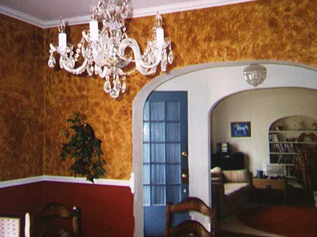 One major project undertaking was the dining room. There were several layers of wallpaper and paint that need to be removed down to the original plaster walls. Holes were then made in the wall to blow in insulation. This house has NO insulation in any wall. After the insulating was completed the holes were patches as well as any cracks in the plaster. A new wallboard ceiling was installed over the original. Painted was done, with a faux finish above the newly installed chair rail. Several unique items were discovered in the process. The arch entry and arc bookcase push out were originally squared off.